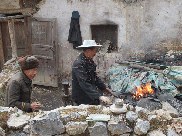 打铁铺也称“铁匠炉”。所谓“铺”只是一间破房子,屋子正中放个大火炉,炉边架一风箱,风箱一拉,风进火炉,炉膛内火苗直蹿。要锻打的铁器先在火炉中烧红,然后移到大铁墩上,由师傅掌主锤,下手握大锤进行锻打。上手经验丰富,右手握小锤,左手握铁钳,在锻打过程中,上手要凭目测不断翻动铁料,使之能将方铁打成圆铁棒或将粗铁棍打成细长铁棍。可以说在老铁匠手中,坚硬的铁块变方、圆、长、扁、尖均可。铁器成品有与传统生产方式相配套的有农具,如犁、耙、锄、镐、镰等,也有部分生活用品,如菜刀、锅铲、刨刀、剪刀等,此外还有如门环、泡钉、门插等。